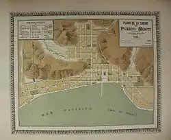 Am 12. Februar 1853 wurde von Vicente Pérez Rosales die Siedlung Melipulli gegründet, was in der Sprache der Mapuche etwa Vier Hügel bedeutet. Der Grundriss wurde in der für koloniale Gründungen typischen schachbrettartigen Form angelegt, sodass geradlinige Straßen von 20 m Breite quadratische Blöcke mit 50 m Seitenlänge umschlossen. Am 22. Oktober 1861 wurde die Siedlung zur Stadt erklärt und zu Ehren des Präsidenten Manuel Montt Torres in Puerto Montt (Montt-Hafen) umbenannt. Im Jahr 1885 hatte die Stadt 3480 Einwohner,[5] darunter viele Deutsche, die eine eigene protestantische Kirche und Schule hatten. Auch in der Umgebung gab es mehrere deutsche Kolonien.[6]