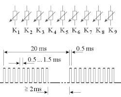 Im RC-Modellbau werden meist acht Werte/Stellungen/Größen pro Sequenz per Funk übertragen. Die acht Pausen befinden sich zwischen 9 Impulsen von 0,5 ms Dauer und üblicherweise einem (TTL) Pegel von 5 V. Jede Pause ist 0,5 bis 1,5 ms lang. Das Basisbandsignal wird per binärem Shift-Keying auf einen Träger aufmoduliert.