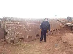 Unvollendeter (auf dem Kopf stehender) Andesitblock mit „Sacklöchern“. Bei analogen vollendeten Exemplaren beherbergt jedes Sackloch eine winzige T-Krampenfassung, was belegt, dass Blöcke dieser Art mit anderen verbunden werden sollten.