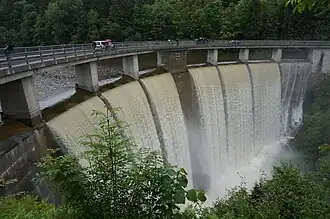Die Rannatalsperre wurde beim Kraftwerksausbau im eng eingeschnittenen Tal der Ranna errichtet, um das Pumpwasser aus der Donau fassen zu können. Es handelt sich um eine Bogengewichtsmauer mit 45 m Höhe und 125 m Kronenlänge,[6] die auch als einspurige Brücke für den Straßenverkehr zwischen den Gemeinden Neustift und Pfarrkirchen dient. Die Mauerkrone weist acht Felder zur Hochwasserentlastung in das Altbett der Ranna auf. An der tiefsten Stelle der Staumauer gibt es einen Grundablass.