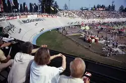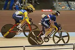 - Durch Rundengewinn, wobei ein oder mehrere Fahrer den Rest des Felds überrunden, wofür 20 Punkte vergeben werden. Als Hauptfeld gilt die größte Gruppe von Fahrern, die auf der Bahn unterwegs sind, wobei die letzte Entscheidung über deren Lage der Rennjury obliegt.[1] Nach einem Rundengewinn reihen sich die Fahrer wieder im Feld ein und werden beim nächsten Zwischensprint nicht mehr gesondert betrachtet. Erfolgt ein Rundengewinn allerdings während einer Sprintrunde, erhalten die Fahrer zusätzlich die Punkte für den Sprint.