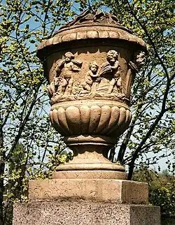 Die Vasen tragen die angedeutete Darstellung des Marcus Curtius, den Ackerbau, Fleiß und Sparsamkeit sowie die Freien Künste. Eine der Vasen trägt die Inschrift: Posteritati MDCCLXXVI.