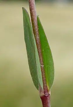 Die Blätter sind – unüblich bei der Gattung Lein – gegenständig. In den oberen Stängelbereichen werden die Blätter teilweise wechselständig. Die Blätter sind kahl, am Grund ohne Drüsen. Die unteren Blätter haben eine elliptische bis verkehrt-eiförmige Form und sind ein- bis zweimal so lang wie breit. Die mittleren und oberen Blätter sind lanzettlich und bis 1 Zentimeter lang, dabei zwei- bis sechsmal so lang wie breit.