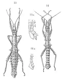 - ↑ Josef Redtenbacher: Die Insektenfamilie der Phasmiden. Vol. 1. Phasmidae Areolatae. Verlag Wilhelm Engelmann, Leipzig 1906, S. 47–53 (Online-Version)
