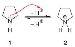 Als sekundäres Amin ist Pyrrolidin eine relativ starke Base.[4] Durch Protonierung am freien Elektronenpaar des Stickstoffs wird das Pyrrolidinium-Ion als konjugierte Säure gebildet.