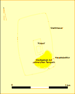 Die ummauerten Städte der Pyu sind entweder rund, wie Sri Ksetra[7] oder rechteckig.[8] Die rechteckige Form ist eventuell aus Indien importiert worden. In allen Städten gab es einen inneren ummauerten Palastbezirk. Die ummauerten Stadtanlagen sind dabei überraschend groß, wobei aber nicht das ganze Stadtgebiet bebaut war, sondern viele Bereiche auch als Ackerland dienten. Kloster und Stupen sind meist in bevorzugten Stadtregionen erbaut worden. Es mag sich hier um Siedlungskerne handeln.