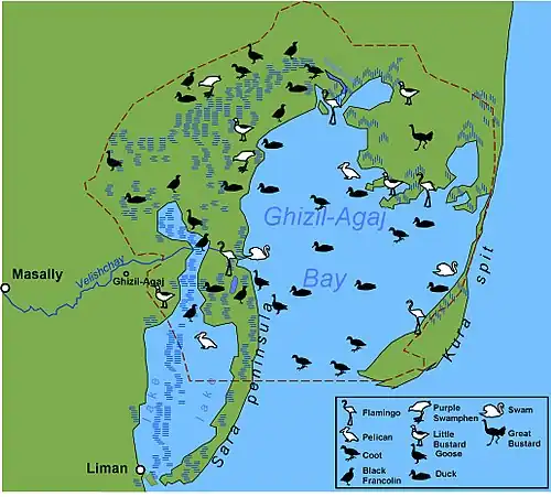 Das Ramsar-Gebiet Kysyl Agatsch war mit rund 88.360 Hektar das größte Naturschutzgebiet Aserbaidschans. Hier überwintern weltweit bedrohte Vogelarten wie die Rothalsgans und die Weißkopf-Ruderente. In den Lagunen und auf vorgelagerten Inseln findet man Rosaflamingos, aber auch der Krauskopfpelikan, Halsbandfrankolin, Reiher, Sichler, Zwergscharben und bedrohte Arten, wie den Steppenkiebitz und die Weißkopf-Ruderente.