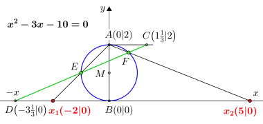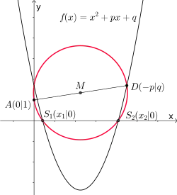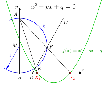Die im Folgenden beschriebene Konstruktion ist prinzipiell anwendbar für Lösungen der Gleichungen, in denen und rationale Zahlen sind. Die im Bild 2 eingezeichnete Parabel ist nicht Teil der Konstruktion, sie dient lediglich der Verdeutlichung.