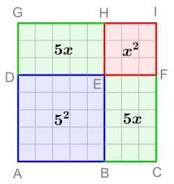 als Spezialfall von mit geometrisch gelöst werden. Man fasst dazu die linke Seite der Gleichung (siehe Bild 2) auf als ein Quadrat EFIH der Seitenlänge (und somit der Fläche ) und zwei Rechtecke DEHG und BCFE mit den Seiten und (und somit jeweils der Fläche ). Das Quadrat und die beiden Rechtecke werden wie im Bild 2 gezeigt zu einem Gnomon mit den Eckpunkten BCIGDE zusammengesetzt. Dieses Gnomon hat nach Voraussetzung eine Fläche von . Ergänzt man es mit dem Quadrat ABED der Seitenlänge (und somit der Fläche ) zu dem Quadrat ACIG, so besitzt dieses die Fläche . Andererseits hat aber dieses Quadrat ACIG nach Konstruktion die Seitenlänge und somit den Flächeninhalt . Wegen schließt man und somit . Die quadratische Gleichung wird also »quadratisch ergänzt« zu mit der (positiven) Lösung (siehe Bild 3).[16] Man beachte, dass man mit dieser geometrischen Methode nicht die negative Lösung erhält.