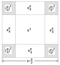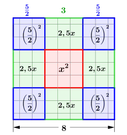 Zur Lösung der quadratischen Gleichungen verwendete al-Chwarizmi keine Äquivalenzumformungen, also keine algebraische Argumentation, sondern in Anlehnung an die griechische Tradition geometrische Argumente (siehe Bild 1). Als Beispiel soll die Gleichung, wie sie bei al-Chwarizmi auftritt,[14][15]