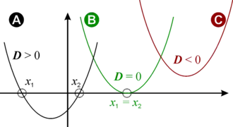 explizit bestimmen. Diese Formel wird als a-b-c-Formel oder Mitternachtsformel bezeichnet. Im Bereich der reellen Zahlen kann eine quadratische Gleichung keine, eine oder zwei Lösungen besitzen. Ist der Ausdruck unter der Wurzel (die sogenannte Diskriminante) negativ, so existiert keine Lösung; ist sie Null, so existiert genau eine Lösung; wenn sie positiv ist, so existieren zwei Lösungen. Insbesondere lässt sich die Anzahl der Lösungen einer quadratischen Gleichung obiger Form bereits durch eine Untersuchung der Diskriminante bestimmen, ohne die Lösungen selbst genau berechnen zu müssen.