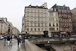 - Nr. 29: Das 1867 an der Stelle eines früheren Eckhauses errichtete Gebäude[10] mit gemischter Nutzung stand sowohl auf dem Quai als auch auf der ehemaligen Place du Pont Saint-Michel und trug die letzte Nummer des Quai, nämlich Nr. 25 im Jahr 1844 und Nr. 27 im Jahr 1855.[11] Der 1855 eröffnete neue Platz erhielt 1865 den Namen Place Saint-Michel. Die Fassaden der Gebäude, die damals rund um diesen Platz entstanden, wurden einer architektonischen überarbeitet und behalten bis heute ihre identischen Fassaden. Das 1867 erbaute neue Eckgebäude erhielt die Nr. 29 Quai Saint-Michel und Nr. 1 Place Saint-Michel.