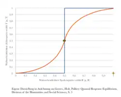 Die QR-Funktion glättet die unstetige errechnete Beste-Antwort-Funktion und repräsentiert monotone und stochastische Wahl als eine Funktion von Auszahlungen[14]. In der Graphik schneiden sich QR-Funktion und Beste-Antwort-Funktion im Nash-Gleichgewicht. Bei einem anderen Rationalitätsparameter verschiebt sich die QR-Funktion und es kommt zu anderen statistischen Vorhersagen bezüglich eines Gleichgewichts. Die QR-Funktion des Gegenspielers errechnet sich analog.