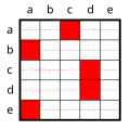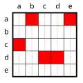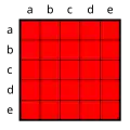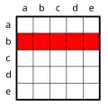 Interessant sind Sätze mit Prädikaten, in denen mehr als eine Leerstelle durch einen Quantor gebunden wird. Die Möglichkeit der Behandlung solcher Sätze macht die große Leistungsfähigkeit der Prädikatenlogik aus, ist aber zugleich der Punkt, an dem das System für den Neueinsteiger etwas kompliziert wird und intensiverer Auseinandersetzung und Übung bedarf. Als kleiner Einblick in die Möglichkeiten der Prädikatenlogik sollen für das einfache zweistellige Prädikat L_1_2, das zum Beispiel wie oben gelesen werden kann als „_1 liebt _2“, alle Möglichkeiten aufgezählt werden, die Leerstellen durch Quantoren zu binden (in den folgenden Diagrammen sind _1 die „vertikalen“ a,b,c,d,e und _2 die „horizontalen“ a,b,c,d,e):