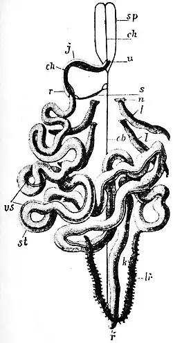 Das Tier hat einen gewundenen Darm, der vorn von den 2 Paar Nephridien bedeckt ist und an dessen Ende ein Paar langer Analvesikel mit Wimpertrichtern sitzt.