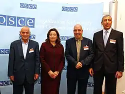 Vertreter des Quartet du dialogue national in Wien 2016: Houcine Abassi (Generalsekretär des tunesischen Gewerkschaftsverbands, UGTT), Wided Bouchamaoui (Präsidentin des tunesischen Arbeitgeberverbandes UTICA), Abdessattar Ben Moussa (Präsident der tunesischen Menschenrechtsliga LTDH) und Noureddine Allegue (Vertreter der tunesischen Anwaltskammer)