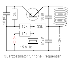 Diese Schaltung ist für höhere Frequenzen dimensioniert und erzeugt – je nach Resonanzfrequenz des Schwingkreises – entweder 15 MHz oder 45 MHz. Den Schwingkreis muss man etwa auf die Frequenz der ungeraden Oberwelle des Quarzes abstimmen, die man erzeugen möchte. Das Synchronisieren der Frequenzen von Quarz und Schwingkreis kann man an der sprunghaften Änderung der Spannung zwischen den Messpunkten A und B erkennen. Auffallend an dieser Schaltung ist das Fehlen einer sichtbaren Rückkopplung. Trotzdem funktioniert diese Schaltung, weil der Transistor interne Kapazitäten sowohl zwischen Kollektor und Emitter als auch zwischen Basis und Emitter besitzt.