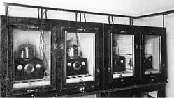 Eine Gruppe von vier weiterentwickelten Quarzoszillatoren aus den Bell Laboratories diente 1929 als nationaler Frequenzstandard der Vereinigten Staaten, wie in nebenstehender Abbildung dargestellt. Um äußere Temperaturschwankungen und damit thermisch bedingte Schwankungen der Genauigkeit des Oszillators zu minimieren, wurden die vier Quarzoszillatoren in beheizten Schränken auf einer konstanten Temperatur gehalten. Beheizte Quarzoszillatoren werden als Quarzofen (englisch Oven Controlled Crystal Oscillator, OCXO) bezeichnet, und dank eines ausgeklügelten Vergleichsverfahrens der Oszillatoren untereinander konnte das National Bureau of Standards die Normfrequenz mit einer Genauigkeit von 1·10−7 angeben.[6]
