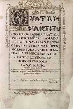Das von Alonso de Chaves verfasste Manuskript Quatri partitu en cosmographia practica, auch Espejo de navegantes genannt, enthält alle praktischen und theoretischen Kenntnisse, die die Piloten benötigen, um vom Piloto Mayor der Casa de la Contratación in Sevilla als Piloto de la Carrera de Indias zugelassen zu werden.[1]