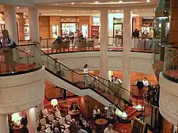 Den Zugang zum Schiff bildet die „Grand Lobby“ mit einem großen Treppenhaus. In unmittelbarer Nähe befindet sich auch das Spielcasino. Das Einkaufszentrum mit einer Fläche von über 500 m² erstreckt sich auf der zweiten Ebene. Von der Lobby führen großzügig gestaltete Gänge zu den öffentlichen Bereichen auf den Decks 2 und 3. An Bord befinden sich über 300 Gemälde mit einem Gesamtwert von etwa fünf Millionen Euro. In Tradition der Reederei Cunard sind darunter auch Porträts der britischen Königsfamilie.