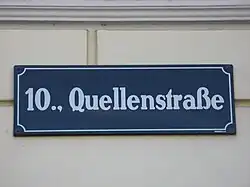 Die Quellenstraße befindet sich im 10. Wiener Gemeindebezirk Favoriten. Sie wurde 1906 nach dem 1874 hier neu errichteten Wasserbehälter der I. Wiener Hochquellenwasserleitung benannt.[1] Davor hieß sie seit 1864 Quellengasse.[2]