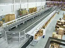 Der Quergurtsorter ist ein Sortier- und Fördersystem für Waren, das aus mehreren rechtwinklig zur Förderrichtung angebrachten kurzen Gurtförderern (Förderband) besteht.