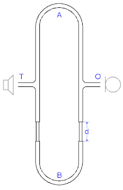 Der Schall gelangt von der Eintrittsöffnung T sowohl über den Rohrbogen A als auch über den Rohrbogen B zur Austrittsöffnung O. Je nach der Wegdifferenz, die durch Verschieben des U-Rohres geändert werden kann, tritt eine Schwächung oder Verstärkung des Tones infolge von Interferenz ein: