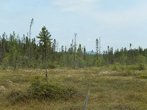 Ansonsten findet man aus der Familie der Heidekrautgewächse Kalmia polifolia und Kalmia angustifolia aus der Gattung der Lorbeerrosen, dann Torfgränke (Chamaedaphne calyculata) und Grönländischer Porst (Rhododendron groenlandicum), aus der Familie der Sauergrasgewächse vor allem Carex oligosperma aus der Gattung der Seggen, Eriophorum virginicum aus der Gattung der Wollgräser, der auch das Scheiden-Wollgras (Eriophorum vaginatum) und das Schmalblättrige Wollgras (Eriophorum angustifolium) angehören. An Bäumen finden sich Schwarz-Fichte (Picea mariana) und Ostamerikanische Lärche (Larix laricina).