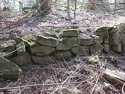 Von der ehemaligen Burganlage sind eine Art Ringwall mit Graben und eine Treppe erhalten sowie Trockenmauerwerk.