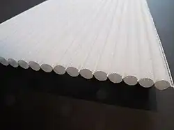Röhrchentaschen bestehen aus einer Anzahl von tangential miteinander verbundenen runden Röhrchen aus Polyestervlies oder Polyestergewebe, die auf beiden Seiten offen sind. Die Anzahl der Röhrchen, die Länge sowie der Durchmesser können, je nach Batterietyp, in dem sie verwendet werden, unterschiedlich sein.