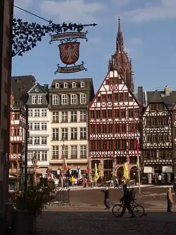 Die historische Bebauung des Römerbergs aus teils gotischen, teils barocken Häusern wurde 1944 bei den Luftangriffen auf Frankfurt weitgehend zerstört. Das heutige Platzbild ist das Ergebnis von äußerlich originalgetreuen Rekonstruktionen und Neubauten der 1950er und 1980er Jahre.