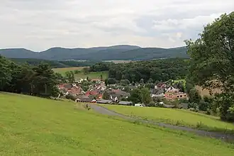 Ortsansicht von Nordwesten. Im Hintergrund die Bergkette des Naturraums Zollbuche (v.l.n.r Dreisberg, Koppe, Hemmerich)