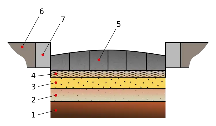 5 Dorsum oder agger viae: die gewölbte Oberfläche (media stratae eminentia) aus behauenen Steinen, Silex oder Basalt, Steinquader je nach Gegend. Die Form der Oberfläche sorgte dafür, dass das Regenwasser ablief und die unteren Schichten trocken blieben