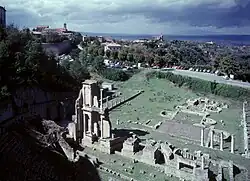 Um 100 v. Chr. herum entstanden in Latium mehrere auf Bergplateaus oder an Bergabhängen gelegene Heiligtümer. Unter diesen architektonisch meist bescheidenen Objekten repräsentiert die spätrepublikanische Terrassenanlage des Heiligtums der Fortuna Primigenia in Praeneste (heute: Palestrina) den Ansatzpunkt einer spezifisch römischen Monumentalarchitektur.[5] Ein alter Kern wurde prachtvoll zu einer axialsymmetrischen Anlage mit sieben künstlichen Terrassen ausgebaut, und zwar in einer Verbindung einheimisch-italischer (Podiumstempel) und hellenistischer Bauformen (Säulenhallen, Freitreppen).