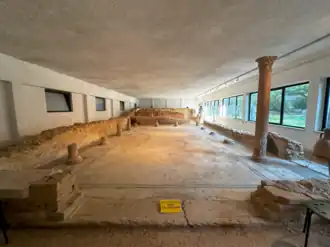 Ein zweiter Raum ist durch einen kleinen Übergangssaal vom Hauptraum getrennt, der nur über ein großes Panoramafenster mit Blick auf die L-förmige Veranda verfügte. Auch dieser Saal ist reich dekoriert: Der Mosaikboden ist weiß mit schwarzem Rahmen, während die Wände mit einem weißen Sockel zwischen zwei roten Streifen bemalt sind, in denen Pflanzen und Vögel zu sehen sind, im oberen Band waren Greifen mit Füllhörnern, weibliche Masken und Stillleben vertreten.[3]