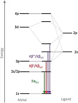 Zur Anregung werden üblicherweise Elektronen oder Röntgenphotonen ausreichender Energie benutzt, jedoch gibt es auch Röntgenquellen, die ihre charakteristische Röntgenstrahlung durch die Abbremsung von Protonen und/oder Ionen erzeugen. Bei einer Messung wird zumeist nur ein bestimmter Energiebereich entsprechend den zu beobachtenden Elektronenübergängen gewählt. Besonders aussagekräftig sind hierbei Übergänge, die den Energien der Valenzelektronen (Valence to Core, kurz VtC/V2C) entsprechen. Diese Übergänge finden sich bei Messung der -Linie als kleiner Hügel auf etwas höheren Energien als der Haupt-Peak (Bild 1). Aus diesem Grund sind die K-Linien auch die am häufigsten untersuchten Emissionslinien. Die genauen Elektronenübergänge sind in Bild 2 einzusehen.