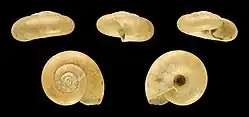 Das rechtsgewundene Gehäuse ist niedrig-konisch mit 3½ bis 4½ Windungen. Es ist 6 bis 11 mm breit und 4 bis 6 mm hoch. Die Windungen sind mäßig gewölbt und nehmen regelmäßig zu. Lediglich das letzte Viertel der Endwindung erweitert sich zur Mündung hin etwas, senkt sich aber nicht ab. Die Naht ist sehr deutlich. Die Mündungsebene steht schräg zur Windungsachse. Die Mündungsöffnung ist in der direkten Aufsicht leicht abgeflacht-elliptisch, von der Eindellung durch die vorige Windung abgesehen. Der Mündungsrand ist gerade und zugespitzt. Der Nabel ist weit und schwach exzentrisch.