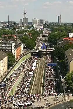 - Am 18. Juli 2010 wurde unter dem Titel Still-Leben Ruhrschnellweg die A40 autofrei. Die Straße wurde 31 Stunden für den Autoverkehr gesperrt und zu einer Bühne der Alltagskultur umfunktioniert. Auf der circa 60 km langen Strecke waren bis zu 20.000 Tische mit Programm der jeweiligen Gruppen, Vereine, Familien, Nachbarschaften, Institutionen usw. zu Fuß zu besichtigen. Die andere Spur konnte mit Fahrrädern oder Inlinern genutzt werden. Die Veranstalter von RUHR.2010 sehen in dieser Veranstaltung den möglichen „emotionalen Gründungsmoment der Metropole Ruhr“.[33] Es wurde geschätzt, dass etwa 3 Millionen Besucher an dieser Veranstaltung teilgenommen haben.[34]