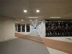 Vor allem in den Stadtzentren und an Bahnhöfen gibt es viele Fahrradabstellanlagen, die zum Teil viele tausend Fahrräder aufnehmen. Jeder Bahnhof verfügt über einen angeschlossenen Fahrradparkplatz, und die meisten bieten auch bewachte Fahrradparkplätze gegen eine geringe Gebühr an. Seit Beginn des 21. Jahrhunderts wurden an über 400 Bahnhöfen Abstellplätze für 450.000 Fahrräder gebaut und modernisiert, und die niederländischen Bahngesellschaften ProRail und NS fordern einen Ausbau um weitere 250.000 bis zum Jahr 2027.[45] Bereits die Hälfte aller niederländischen Bahnreisenden fährt mit dem Fahrrad zum Bahnhof, das sind täglich eine halbe Million Radfahrer.[45] Diese Art von Fahrradabstellanlagen gibt es auch an anderen Orten in den meisten Städten, zum Beispiel gibt es 20 bewachte Fahrradabstellanlagen in der Stadt Groningen (≈198.000 Einwohner).