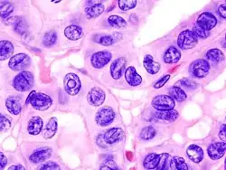 Die epithelialen Karzinome der Schilddrüse, nämlich die häufigsten Untertypen papilläres Karzinom (etwa 70 %) und follikuläres Karzinom (etwa 20 %), und ihre Absiedlungen (Metastasen) haben noch ausgeprägte Ähnlichkeiten mit ihrem Ursprungsgewebe. Zum einen exprimieren sie den Natrium-Jodid-Symporter und haben daher die Fähigkeit zur Jodspeicherung, zum anderen produzieren sie Thyreoglobulin, das daher als Tumormarker dienen kann. Schilddrüsenkarzinome werden nicht selten als kalte Knoten in einer Schilddrüsenszintigraphie auffällig, das heißt die Neigung zur Jodspeicherung ist geringer ausgeprägt als bei umgebendem gesundem Schilddrüsengewebe. Unter der Stimulation mit hohen Spiegeln von TSH besteht aber auch bei bösartigen (malignen) Schilddrüsenzellen eine Aufnahme von Jod.