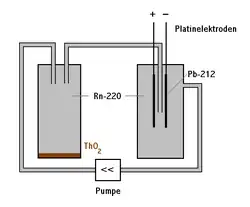 • Die Thorium-Kuh: Dieser Generator ist einer der ältesten. In einem Gefäß befindet sich natürliches Thorium (Th-232) in Form von Thoriumdioxid oder sein Zerfallsprodukt Th-228. Thorium zerfällt in das Edelgas Radon (Rn-220). Dieses wird in einem gesonderten Gefäß gesammelt. Rn-220 zerfällt schnell (Halbwertszeit 55s) über Po-216 zu Pb-212. Dieses Bleiisotop wird an einer negativen Platinelektrode abgeschieden und kann nach einiger Zeit abgelöst werden.