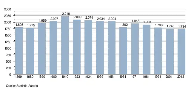 Seit 1869 bleibt die Bevölkerungszahl zwischen 1734 und 2218 Einwohner relativ konstant, wobei die Zahl 1910 ihren Höhepunkt zeigt und heute den niedrigsten Wert aufweist (s. Abb. unten, nach Statistik Austria).