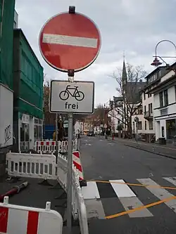 - Fahrradschieben: „Wer ein Fahrrad schiebt, gilt nicht als Radfahrer“ (§ 65 Abs. 1 zweiter Halbsatz StVO) seit der 20. Novelle der Straßenverkehrsordnung. Damit sollte erreicht werden, dass Fahrräder nicht auf der Fahrbahn geschoben werden müssen, „da nicht zwischen einem Fußgänger als solchem und einem Fußgänger, der zusätzlich ein Fahrrad neben sich herschiebt, unterschieden werden soll“.[40] Nach herrschender Rechtsmeinung und Spruchpraxis ist daher zwar nicht vom Gesetzeswortlaut, jedoch von der Rechtsauslegung, wer ein Fahrrad schiebt ein Fußgänger. Verboten ist demnach das Schieben von Fahrrädern auf Radfahranlagen und der allgemeinen Fahrbahn, zulässig ist es jedoch auf Gehwegen, Gehsteigen und in Fußgängerzonen. Explizit nach StVO ist das Schieben von Fahrrädern in Wohnstraßen und in Straßen mit allgemeinem Fahrverbot (Verbotszeichen Fahrverbot (in beiden Richtungen)) zulässig.