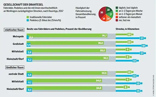 In Deutschland wurden 2017 täglich etwa 28 Millionen Fahrten mit einer Weglänge von zusammen rund 112 Mio. km mit dem Fahrrad erbracht.[3] In der Schweiz werden täglich etwa 8 Mio. km gefahren.[4]