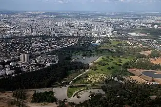 ![]() Blick auf den Ramat Gan Safaripark mit der Stadt Tel-Aviv im Hintergrund | |||