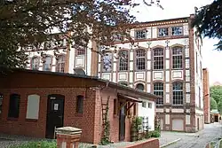 Auf der Hofseite befinden sich mehrere dreigeschossige Fabrikhallen, die im späten 19. Jahrhundert gebaut wurden. Ein langgestrecktes Gebäude entstand in der Zeit um 1900. Die Fassade ist mit verschiedenen Baustoffen gegliedert, die Fenster befinden sich in mit Segmentbögen gestalten Fensteröffnungen. Das Haus verfügt über einen Mittelrisalit mit Ziergiebel.