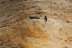 In der Nordwand der ehemaligen Sandgrube ist ein etwa fünf Meter mächtiges Profil der Oberen Meeresmolasse (OMM) aufgeschlossen. Es handelt sich um meist karbonatisch zementierte, überwiegend geringverfestigte Sandsteine, die kleine Gerölle und Muschelschill enthalten. Stellenweise ist deutlich Schrägschichtung erkennbar. An identifizierbaren Fossilien treten vor allem Überreste von meeresbewohnenden Weichtieren auf, in erster Linie Austern der Art Crassostrea giengensis sowie Turmschnecken und Herzmuscheln.[1] Neben den Schrägschichtungsstrukturen sind im Aufschluss auch Kreuzschichtungen zu finden. Diese entstehen durch wechselnde Strömungsrichtungen des Meerwassers, wie sie beispielsweise in Wattgebieten aufgrund des Gezeitenrhythmus auftreten.