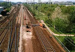 ![]() Rangierbahnhof Einsiedlerhof, Ansicht auf den Ablaufberg mit dahinter liegender Richtungsgruppe, Aufnahme ca. 1988