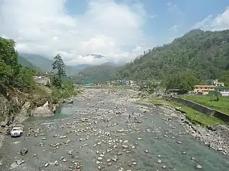 ![]() Rangpo Chu oberhalb seiner Mündung in die Tista; am rechten Flussufer die Stadt Rangpo | ||