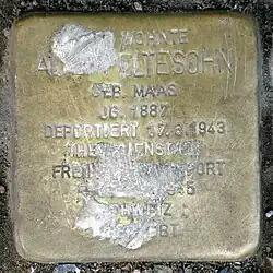 Zwei Stolpersteine erinnern an das Ehepaar Siegfried und Alice Peltesohn, die 1943 nach Theresienstadt deportiert wurden. Ihr Schicksal ist außergewöhnlich: beide gehörten zu den 1200 jüdischen Gefangenen, die durch eine Vereinbarung zwischen Heinrich Himmler und Jean-Marie Musy und eine Zahlung von 1,25 Millionen Dollar am 5. Februar 1945 aus Theresienstadt in die Schweiz ausreisen durften und so den Holocaust überlebten.[8]